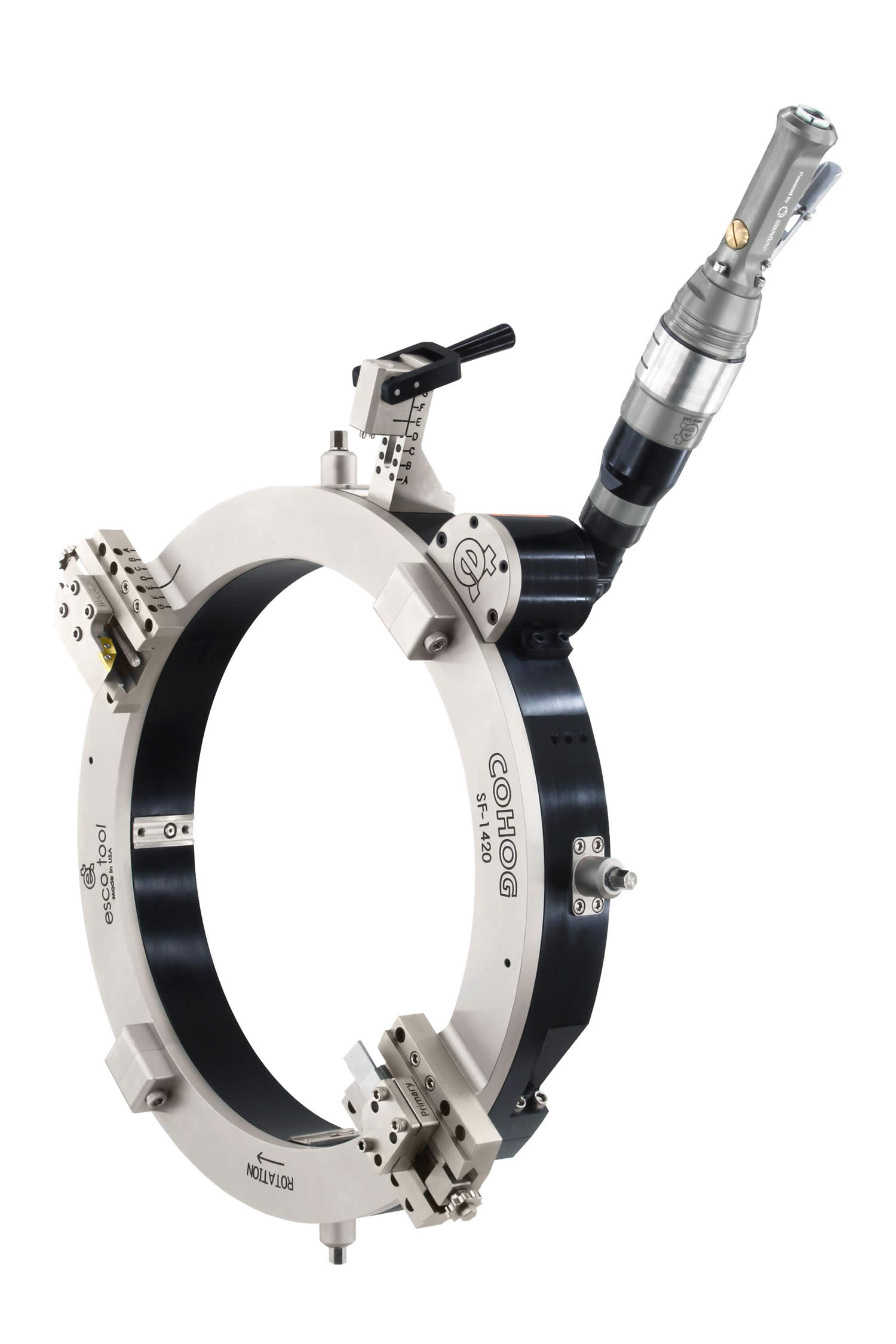 The COHOG quickly cuts and bevels heavy walled pipe in one operation without vibration or chatter. The Cohog’s unique design eliminates the complication associated with traditional O.D. mounted tube and pipe clamshells. The frame is made from the strongest aluminum obtainable and features self-squaring clamp legs that quickly align and secure the machine.
